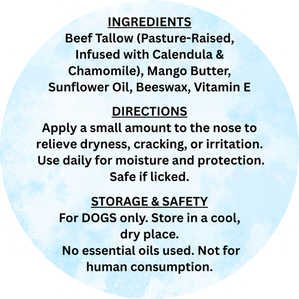 Boop Balm is a gentle, tallow-based nose balm formulated to moisturize and protect your dog’s delicate snout. Crafted with pasture-raised beef tallow, mango butter, sunflower oil, and a soothing infusion of calendula and chamomile, it helps relieve dryness, cracking, and irritation from weather, allergies, or sun exposure.